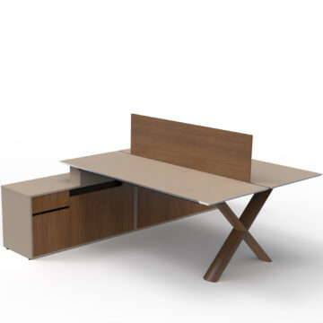 Križno oblikovane noge od aluminijskog profila, obložene drvom, osiguravaju čvrstoću i moderan izgled koji se lako prilagođava različitim stilovima ureda.