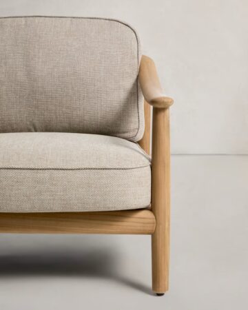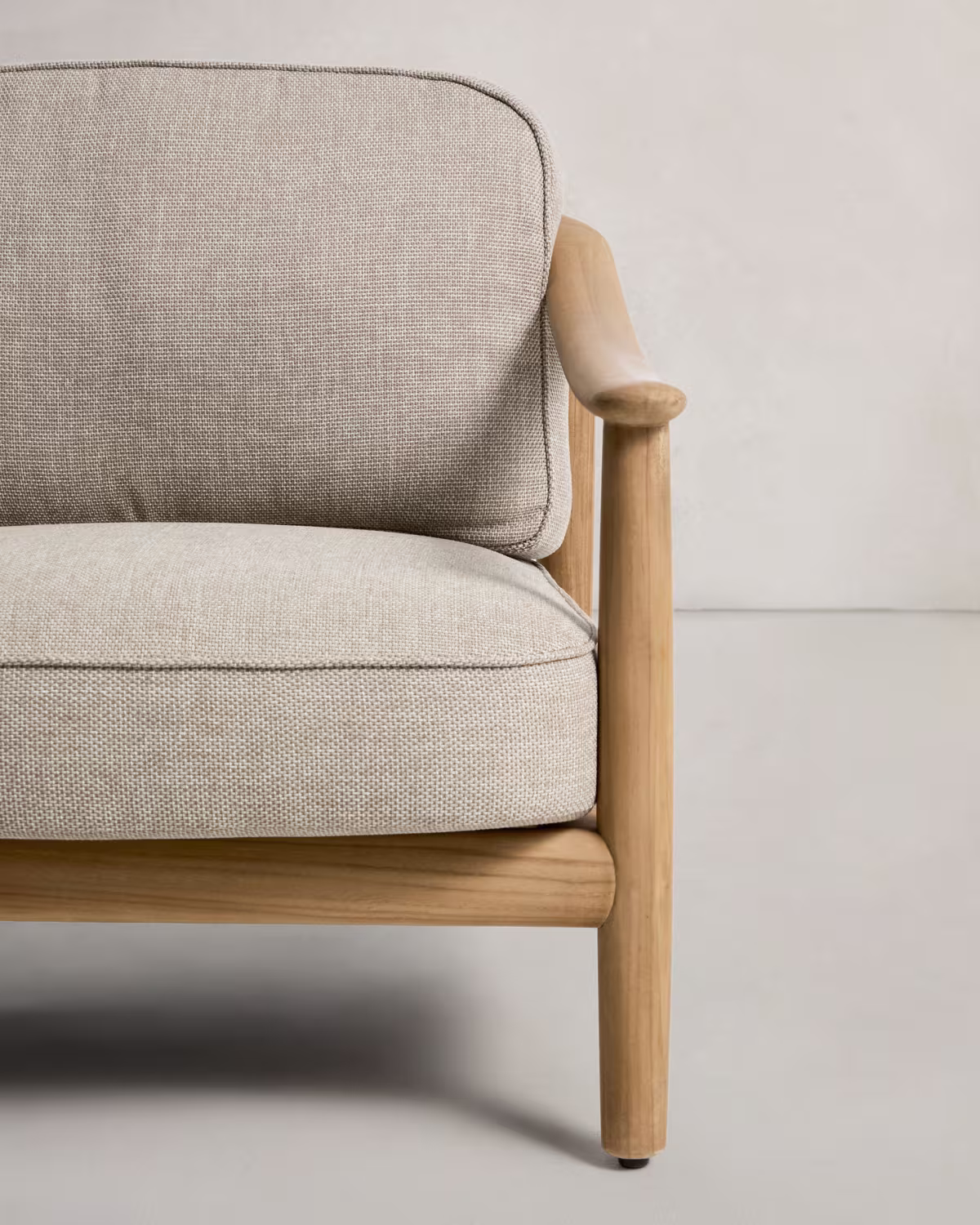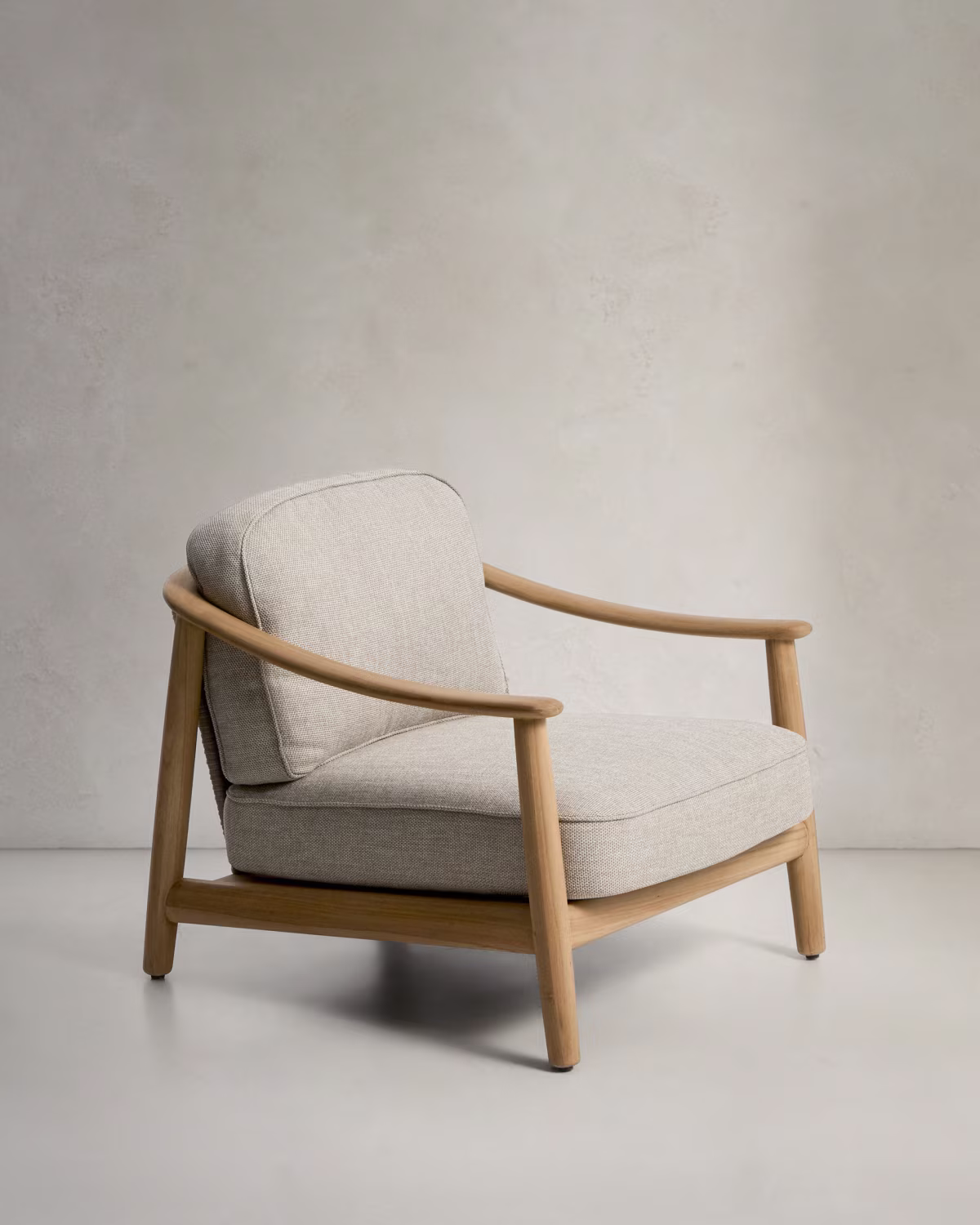 Vanjska fotelja Elunda od masivnog tikovog drveta spaja prirodnu toplinu, udobnost i otpornost za korištenje na otvorenom. Mekane linije konstrukcije i ručno pleteno naslonjalo stvaraju ugodan ambijent za opuštanje na terasi ili u vrtu.