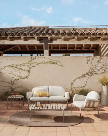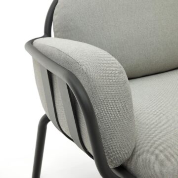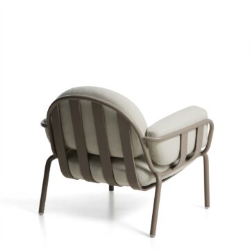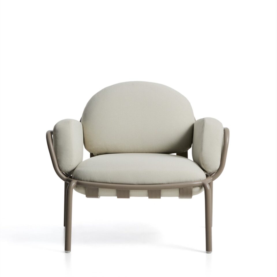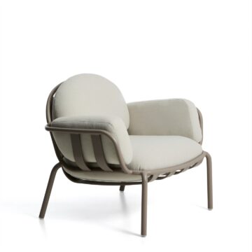 Zunanji počivalnik Joncols iz aluminija v zeleni, sivi ali taupe barvi z bež blazinami združuje organski dizajn, udobje in odpornost za uporabo na prostem. Navdihnjen z oblikami rečnih kamnov se naravno zlije z okoljem in hkrati doda izrazit slog.