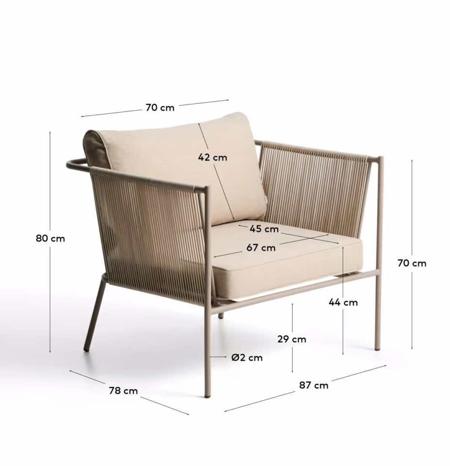 Vanjska fotelja Zivia s užetom u ecru nijansi i konstrukcijom od galvaniziranog čelika u taupe boji spaja minimalistički dizajn, izdržljivost i suvremen izgled. Čiste, ravne linije stvaraju osjećaj reda i vizualne smirenosti, zbog čega se lijepo uklapa u moderne vanjske ambijente.