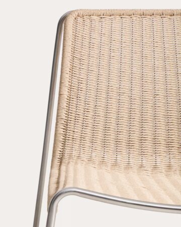 Vanjska složljiva fotelja Tavari s naslonima spaja bež pleteno sintetičko uže i konstrukciju od nehrđajućeg čelika s brušenim izgledom. Svojim laganim, suvremenim izgledom i otpornim materijalima odličan je izbor za terase, balkone, vrtove, ljetne kuhinje ili natkrivene vanjske blagovaonske kutke.