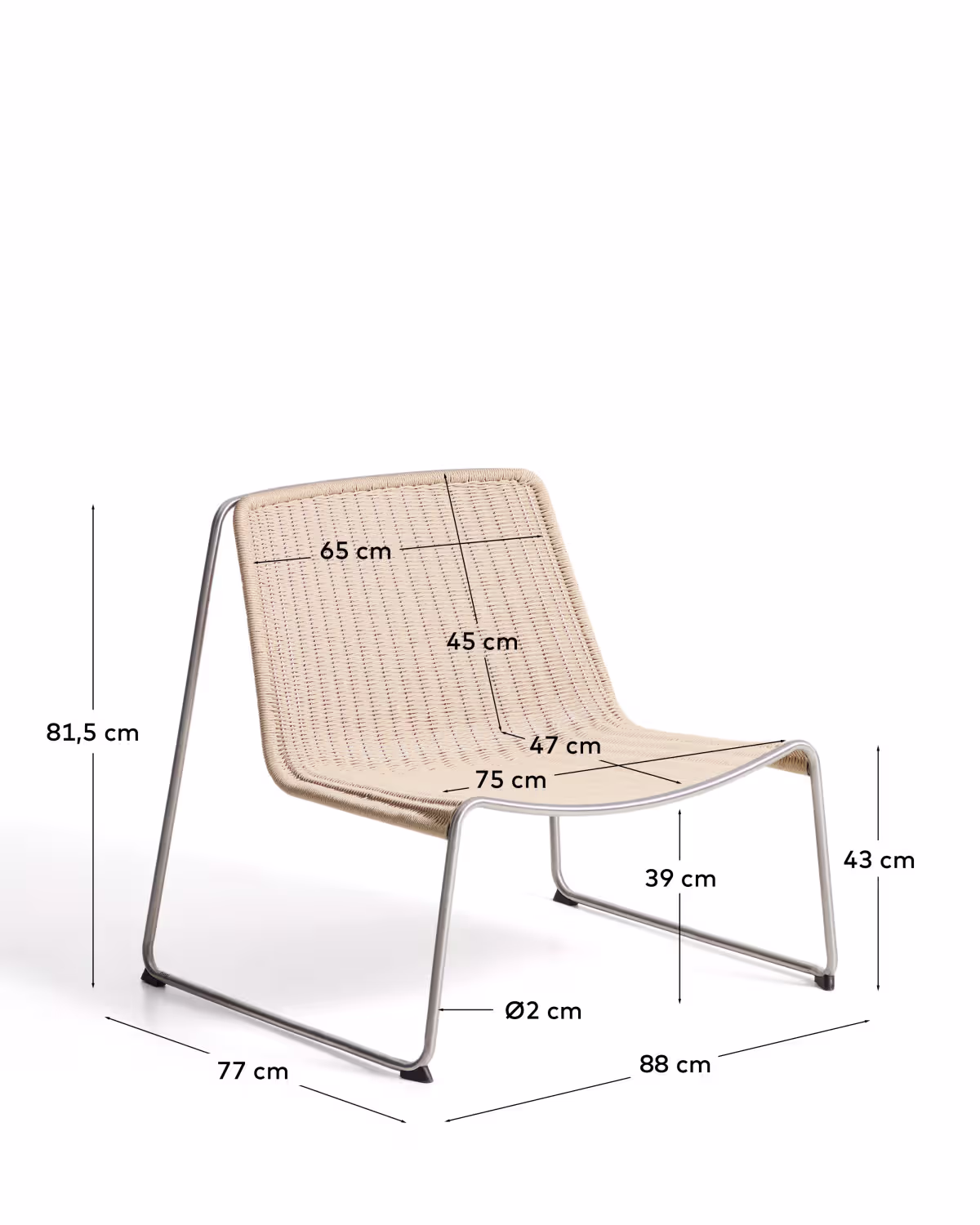 Vanjska složljiva fotelja Tavari s naslonima spaja bež pleteno sintetičko uže i konstrukciju od nehrđajućeg čelika s brušenim izgledom. Svojim laganim, suvremenim izgledom i otpornim materijalima odličan je izbor za terase, balkone, vrtove, ljetne kuhinje ili natkrivene vanjske blagovaonske kutke.