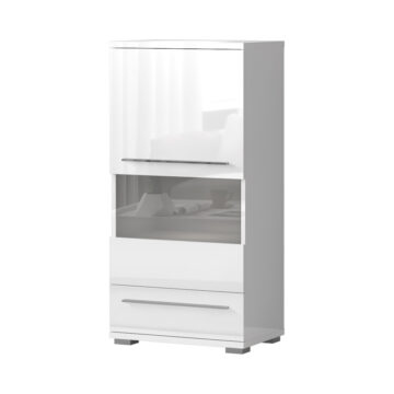 Vitrina Radda PIANO je UV lakirana na visoki sjaj u bež ili bijeloj boji. Sadrži jedna vrata i jednu ladicu. Donja i gornja ploča su 25mm i s time još jače. Ručke i noge su kromirani. Sve fronte se tiho zatvaraju. Vitrina je iz vrlo opsežnog programa, koji ima na raspolagu ogroman broj elemenata.