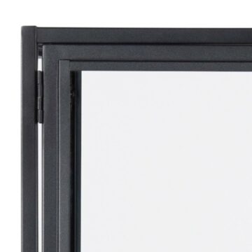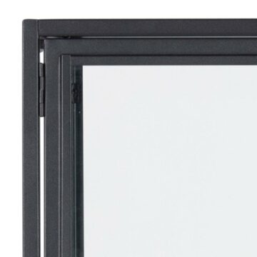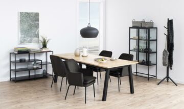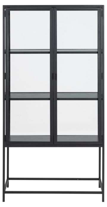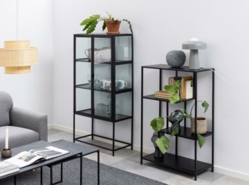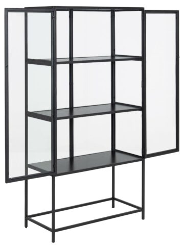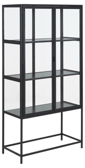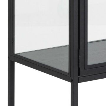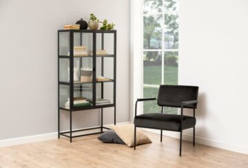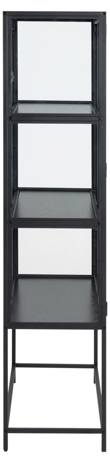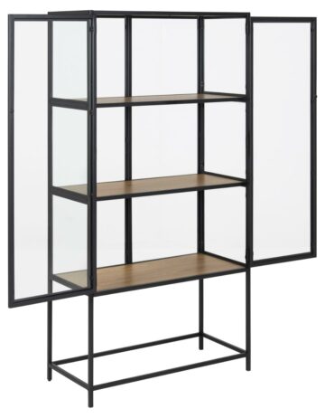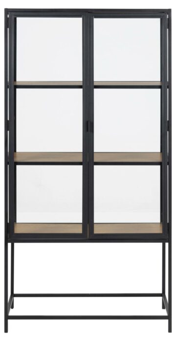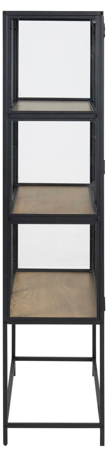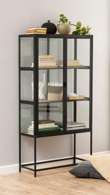Crna boja impresionira i ovaj put kod modela vitrine Seaford. Uzka i visoka vitrina primjerena je za zapunjavanje kutova, a sa svojim staklenim vratima i 3 policama idealna za razpoređivanje stvari. Svoju masivnost odaju police koje su na odabir u verziji iz divljeg hrasta ili mješavine melamina i jasena.