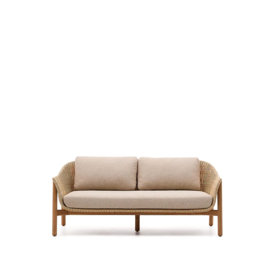 Dimenzije in materiali: 170,5 × 80,5 × 73 cm (š × g × v), višina sedišča 39 cm, globina sedišča 64 cm, širina sedišča 144 cm, višina nog 25 cm; materiali: 40 % tikovina (Tectona grandis), 30 % sintetični ratan, 20 % tkanina (100 % polipropilen), 10 % aluminij, pena v blazinah, vodni zunanji premaz; debelina blazine 12 cm; teža 30 kg; toleranca mer ±2 cm.