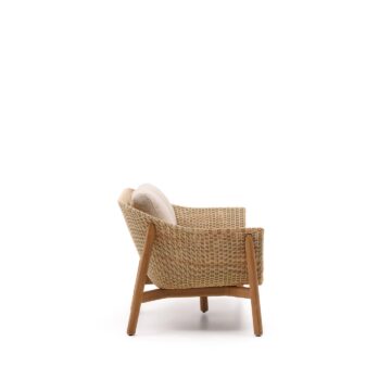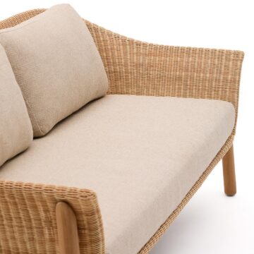 Konstrukcija iz tikovine, aluminija in pletenega ratana zagotavlja stabilnost ter odpornost na zunanje razmere, blazine s hitro sušečim polnilom pa nudijo udobno sedenje. Prevleke so snemljive, tkanina je vodoodbojna, odporna na obrabo in enostavna za čiščenje. Gumijaste podloge na nogah izboljšajo stik s podlago, največja nosilnost znaša 330 kg.