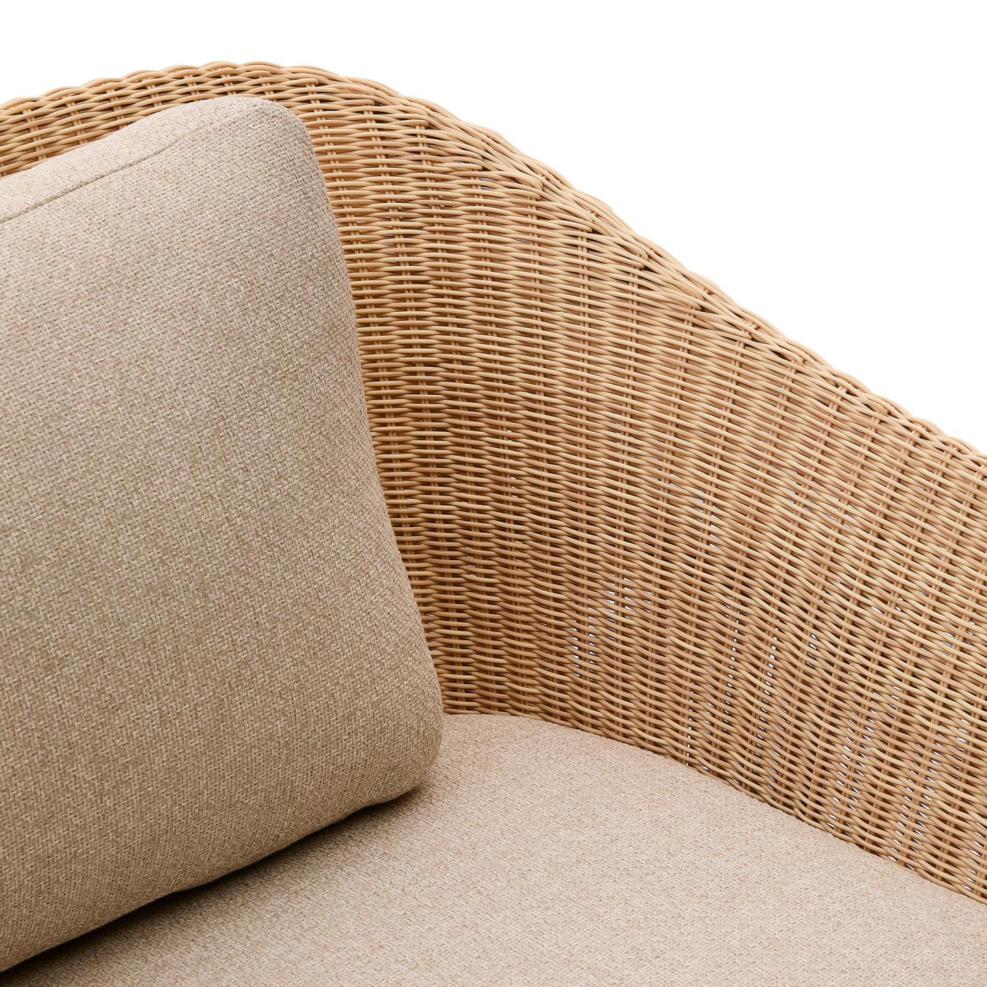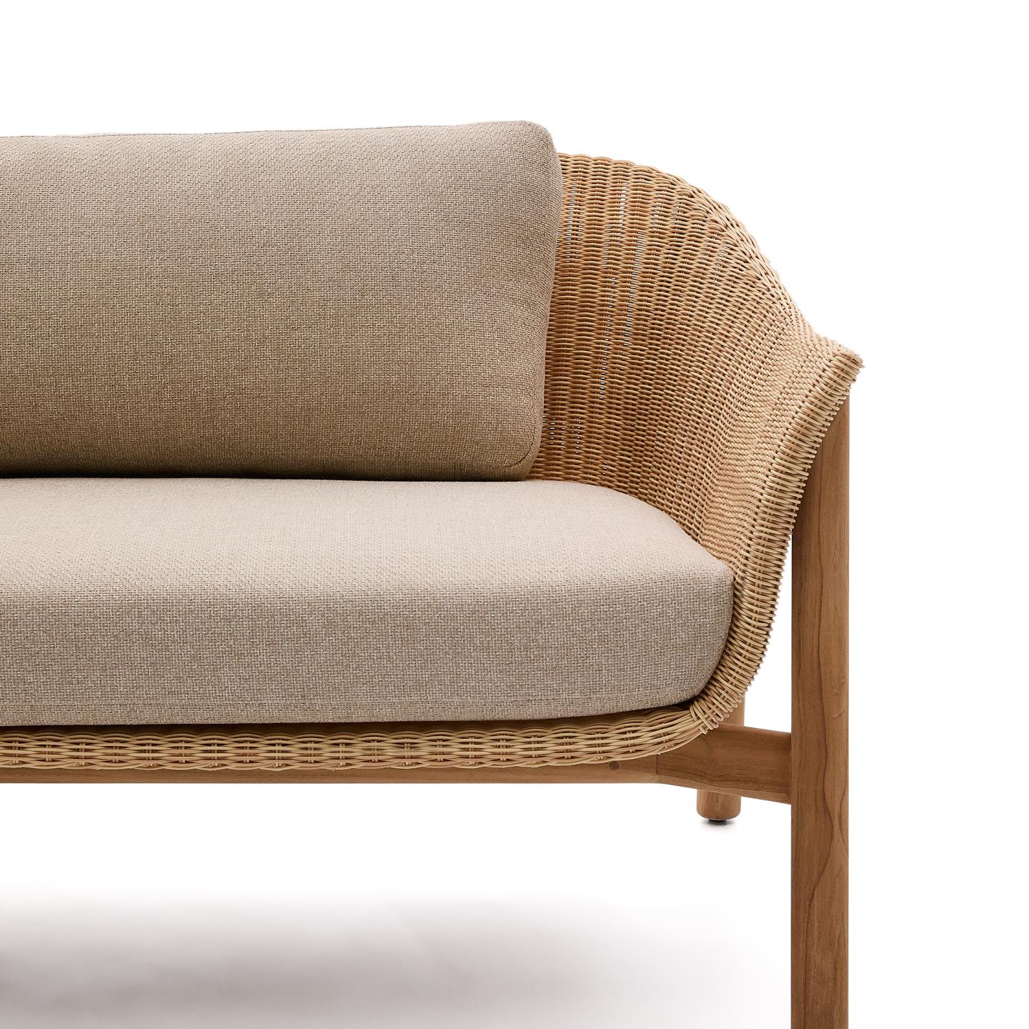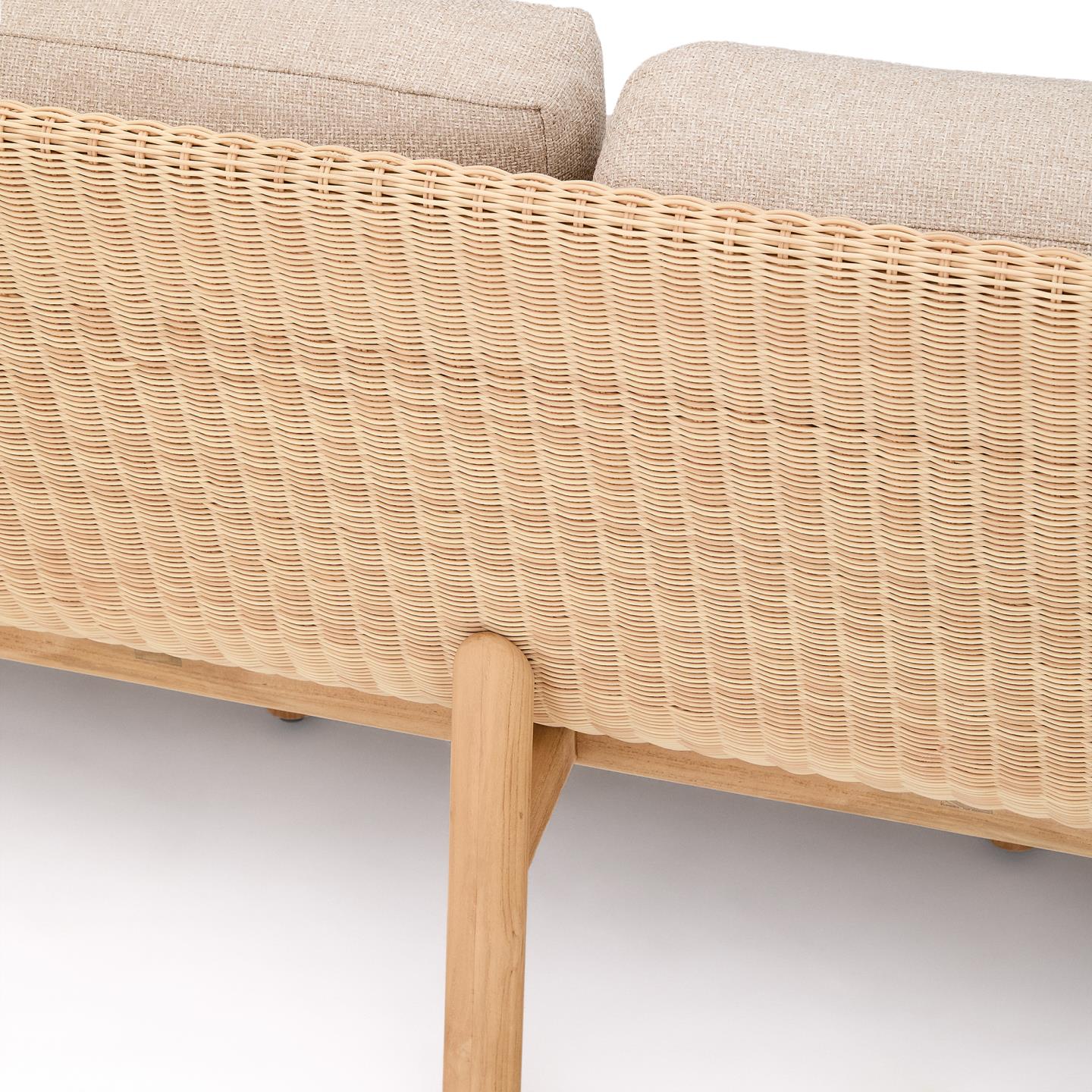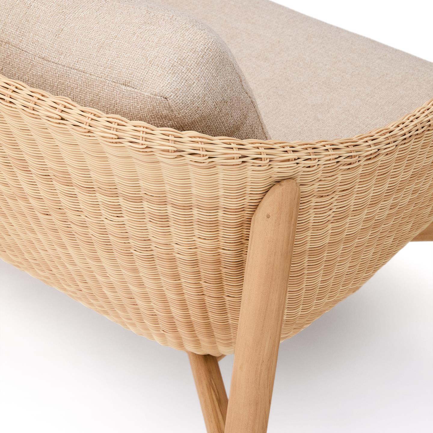 Konstrukcija iz tikovine, aluminija in pletenega ratana zagotavlja stabilnost ter odpornost na zunanje razmere, blazine s hitro sušečim polnilom pa nudijo udobno sedenje. Prevleke so snemljive, tkanina je vodoodbojna, odporna na obrabo in enostavna za čiščenje. Gumijaste podloge na nogah izboljšajo stik s podlago, največja nosilnost znaša 330 kg.