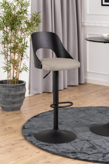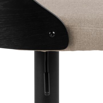 Barski stol Lucy združuje sodoben občutek s klasično skandinavsko estetiko, kar se odraža v njegovih prefinjenih podrobnostih in vrhunski funkcionalnosti. Stol se ponaša z zaobljenim naslonom iz črno luženega hrastovega furnirja z odprtim hrbtom ter oblazinjenim sedežem v peščeni barvi, ki ustvarja eleganten in topel videz. Stoji na mat črnem trobentastem podnožju iz grobo prašno lakiranega jekla, ki omogoča vrtenje in prilagoditev višine s pomočjo plinskega dvigala, kar zagotavlja dodatno udobje in prilagodljivost.