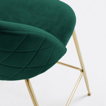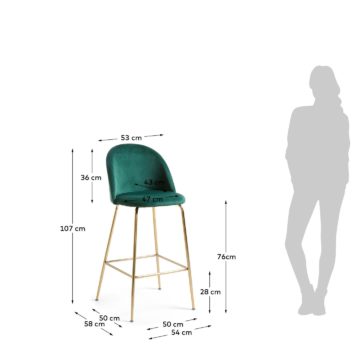 Kovinski barski stol Mystere sestavljata klasično oblikovano jekleno podnožje, oživljeno z zlatim finišem, in udobno oblikovano sedišče, oblečeno v kakovostno žametno tkanino. Stol je izdelan v retro slogu, ki bo s pridihom ekstravgance vizualno popestril številne prostore. Tkanina je dobavljiva v turkizni, modri in zeleni barvi. Dimenzija (višina x širina x globina): 107/53/58 cm Teža: 6,5 kg