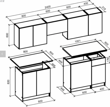 - spodnje omarice z leve proti desni; omarica z dvojnimi vrati širine 80 cm, omarica z enojnimi vrati 60 cm, omarica s predalom in vratim širina 40 cm, višina 85 cm , globina 60 cm