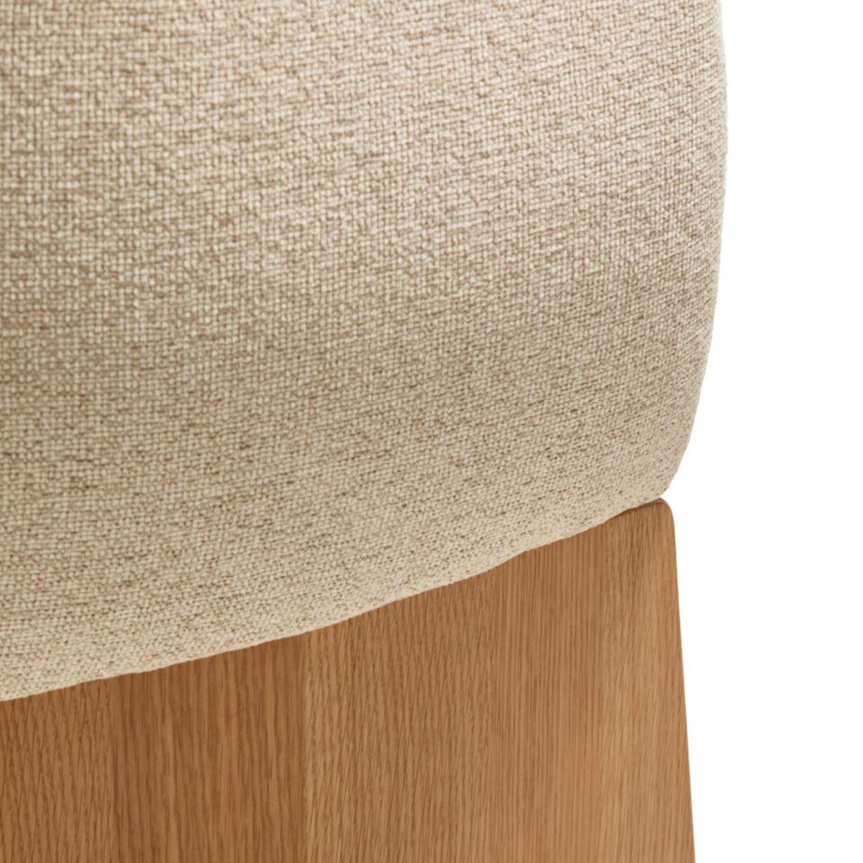Sedišče srednje trdote zagotavlja notranja konstrukcija iz elastičnih trakov, vzmeti in injekcijske pene gostote 55 kg/m³, ki ohranja obliko skozi čas. Oblazinjenje iz drobno strukturiranega chenilla je mehko na dotik, odporno za vsakodnevno uporabo in izdelano iz 100 % recikliranega poliestra pri dobavitelju s certifikatom Global Recycled Standard; tkanina ima vodoodbojno obdelavo in certifikat OEKO-TEX® STANDARD 100 za okolju prijazno proizvodnjo. Podnožje iz vezane plošče je zaščiteno z nerjavnim jeklenim obodnim okvirjem, noge pa imajo zaščitne podloge za preprečevanje poškodb tal.