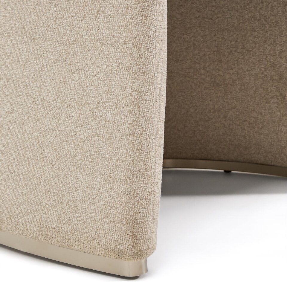 Sedišče srednje trdote zagotavlja notranja konstrukcija iz elastičnih trakov, vzmeti in injekcijske pene gostote 55 kg/m³, ki ohranja obliko skozi čas. Oblazinjenje iz drobno strukturiranega chenilla je mehko na dotik, odporno za vsakodnevno uporabo in izdelano iz 100 % recikliranega poliestra pri dobavitelju s certifikatom Global Recycled Standard; tkanina ima vodoodbojno obdelavo in certifikat OEKO-TEX® STANDARD 100 za okolju prijazno proizvodnjo. Podnožje iz vezane plošče je zaščiteno z nerjavnim jeklenim obodnim okvirjem, noge pa imajo zaščitne podloge za preprečevanje poškodb tal.