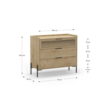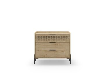 Komoda Inca s tremi predali ponuja kombinacijo funkcionalnosti in prefinjenega videza. Zgornji predal je poudarjen z dekorativnim perforiranim vzorcem, ki daje kosu pohištva značaj, medtem ko svetel hrastov dekor in črne kovinske noge poskrbijo za sodoben in brezčasen videz.