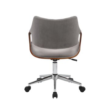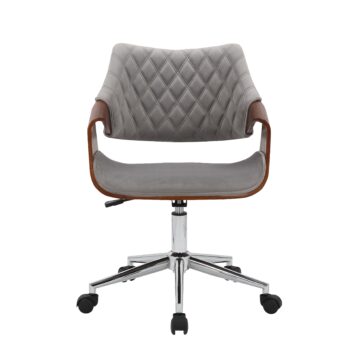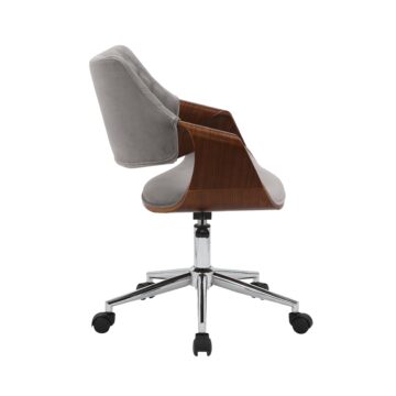 Stol je preoblečen v trpežno pliš tkanino svetlo sive barve v kombinaciji z vezano ploščo, barve temnega oreha.
