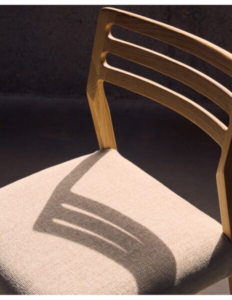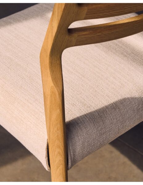 Stol Cudia združuje toplino blaga chenille in plemenitost masivnega hrasta. Njegov sodoben skandinavski dizajn slavi preprostost in funkcionalnost, čiste geometrijske linije pa ustvarjajo minimalističen videz, ki se popolno ujema z lahkotno in zračno konstrukcijo. Hrastov les je znan po svoji trpežnosti in brezčasni eleganci, zato je idealna izbira za notranje pohištvo. Oljni zaključek na osnovi PU daje lesu gladek in topel otip ter dopolnjuje njegov naravni videz. Les prihaja iz virov s certifikatom FSC Mix Credit.