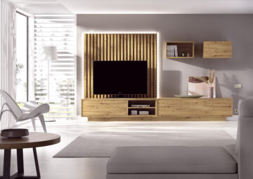 Moderni Dnevni regal Compactos 6 z zidnimi paneli je predstavljen v Nordic odtenku. Sestavljen je iz TV omarice z zložljivimi vrati in odprtino, osnovne omarice, rešetkastega panela ter dveh visečih modulov.