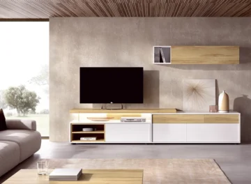 Ta modularni sestav vključuje dva osnovna modula z odprtinami, predali in zložljivimi vrati, TV stojalo s steklom ter viseči modul z dvižnimi vrati.