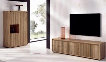 Sestav vključuje TV omarico in visoko vitrino s tremi vrati ter odprtim prostorom.