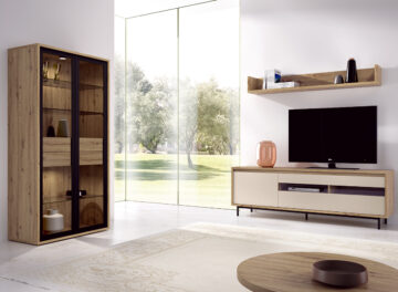 Dnevni regal Compactos 49 je sestavljen iz TV omarice, dvovratne vitrine in viseče police, kar ustvarja prijetno in sodobno vzdušje. Sestav je prikazan v barvi Nordic in Arena.