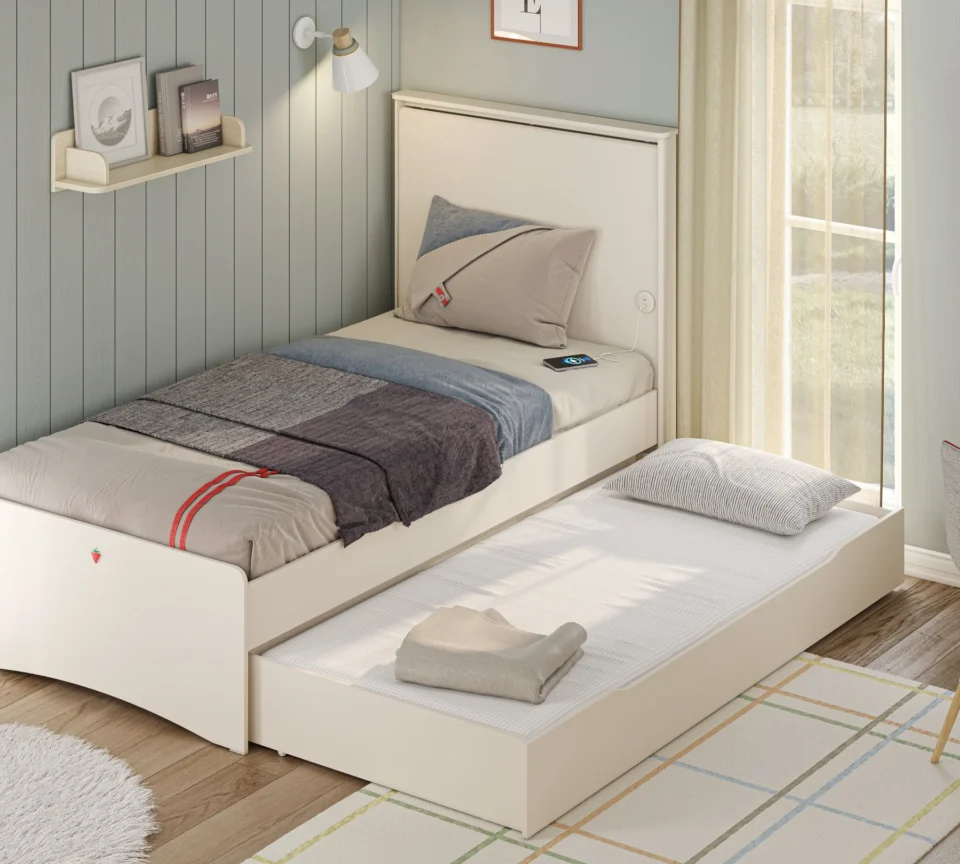 Dodatna postelja Varia ki jo je mogoče uporabiti tudi kot shrambo pod posteljo, s svojim preprostim in elegantnim dizajnom ponuja modernistično interpretacijo dekorja mladinske spalnice.