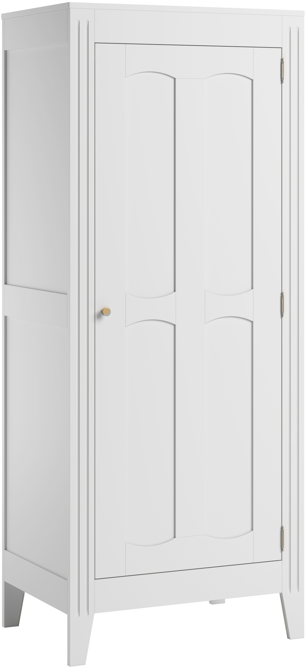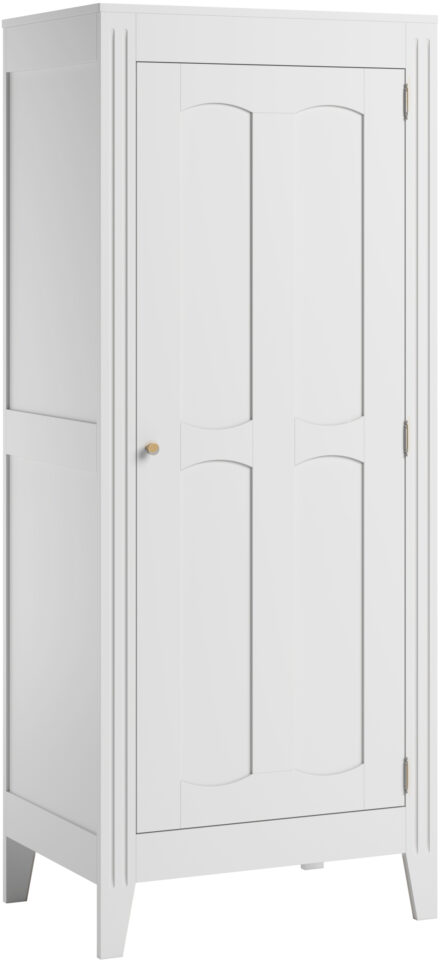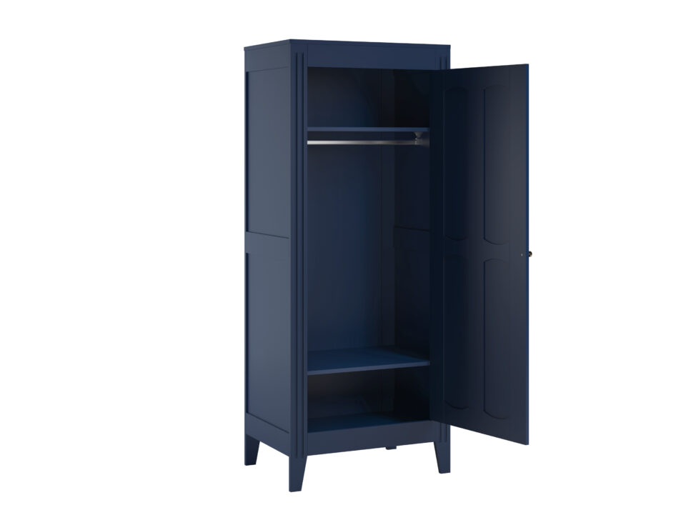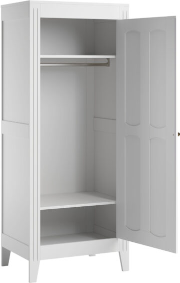 V notranjosti je nameščen drog za obešanje in dve polici, kar ponuja ravno pravšnjo kombinacijo odprtega in zaprtega shranjevanja. Višina omare je prilagojena temu, da v prostoru deluje elegantno in zračno.