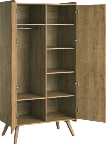 Levi del omare vključuje zgornjo in spodnjo polico, med katerima je nameščen drog za obešalnike. Desni del je razdeljen na štiri police, primerne za organizirano shranjevanje oblačil, igrač ali drugih predmetov. Omara nima izstopajočih ročajev, saj je opremljena s sistemom push-to-open, kakovostno okovje pa zagotavlja gladko in udobno uporabo. Za večjo varnost so robovi pohištva zaobljeni.