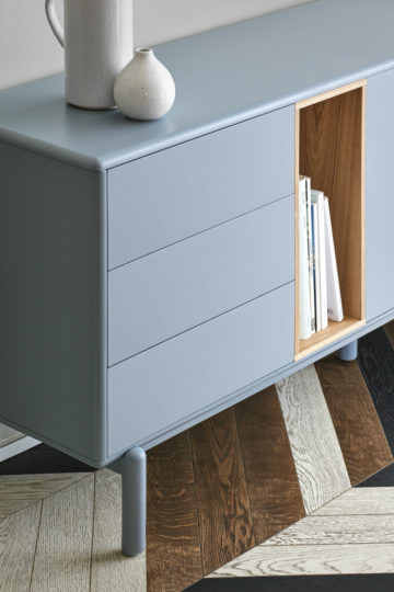 Zaobljeni robovi okvirjev in podnožja v kombinaciji z jasno definiranimi in urejenimi linijami predalov, ustvarjajo interesantno kombinacijo oblik. Prijetna pastelna barva in preprost, minimalen dizajn brez ročk poskrbita za prilagodljiv in nežen videz. Dnevna soba v zasedbi kolekcije Corvo bo tako postala udobnejši in nežnejši prostor.