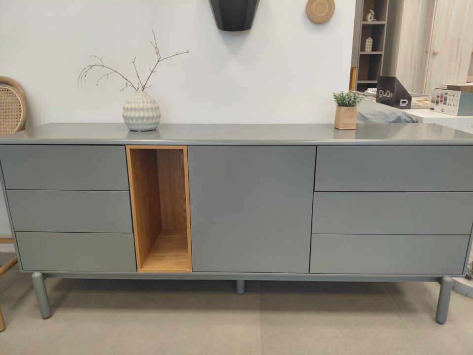 Komoda ima ena vrata, eno polico, šest predalov in odprt predel.