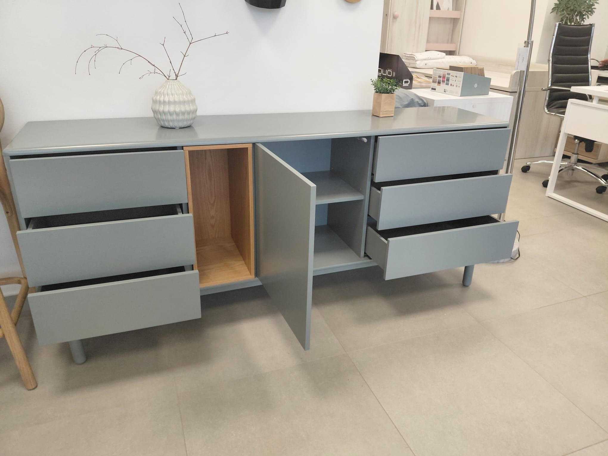 Komoda ima ena vrata, eno polico, šest predalov in odprt predel.