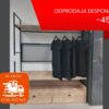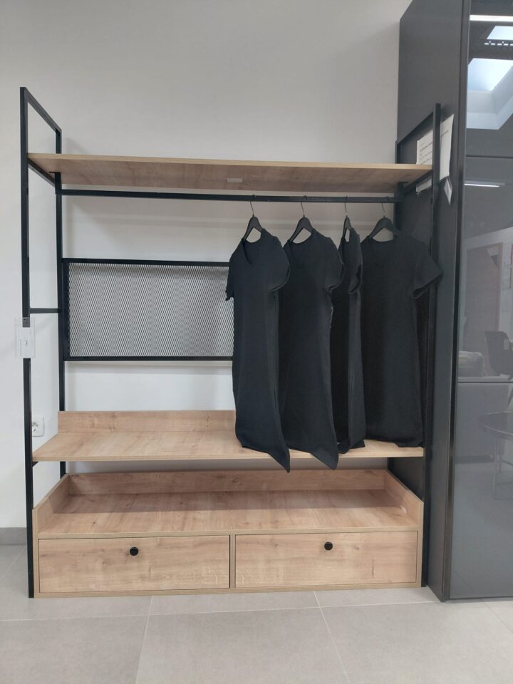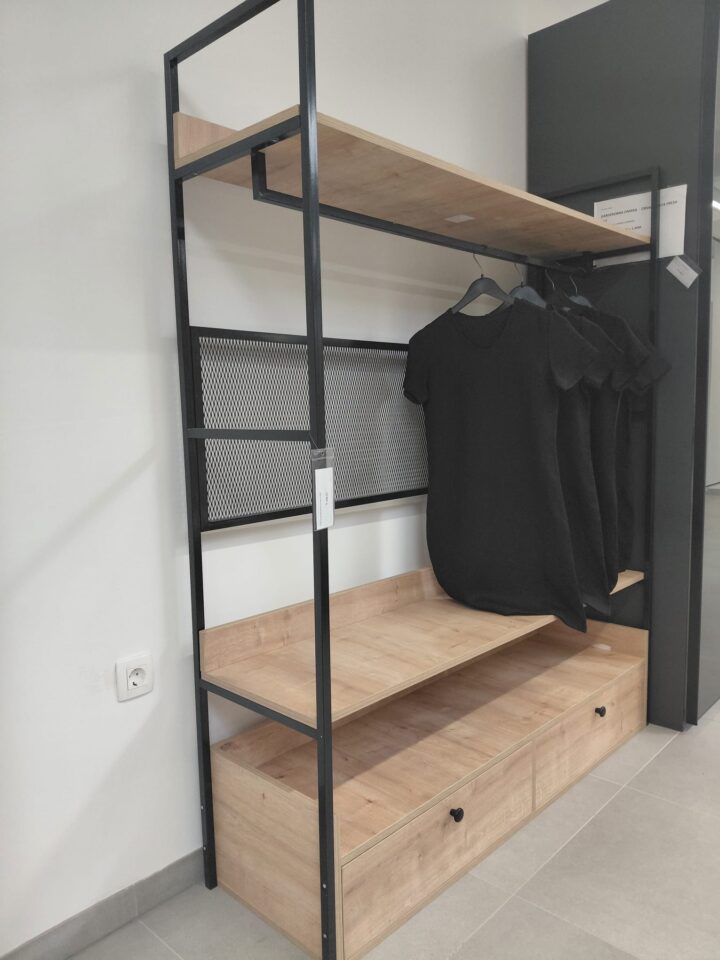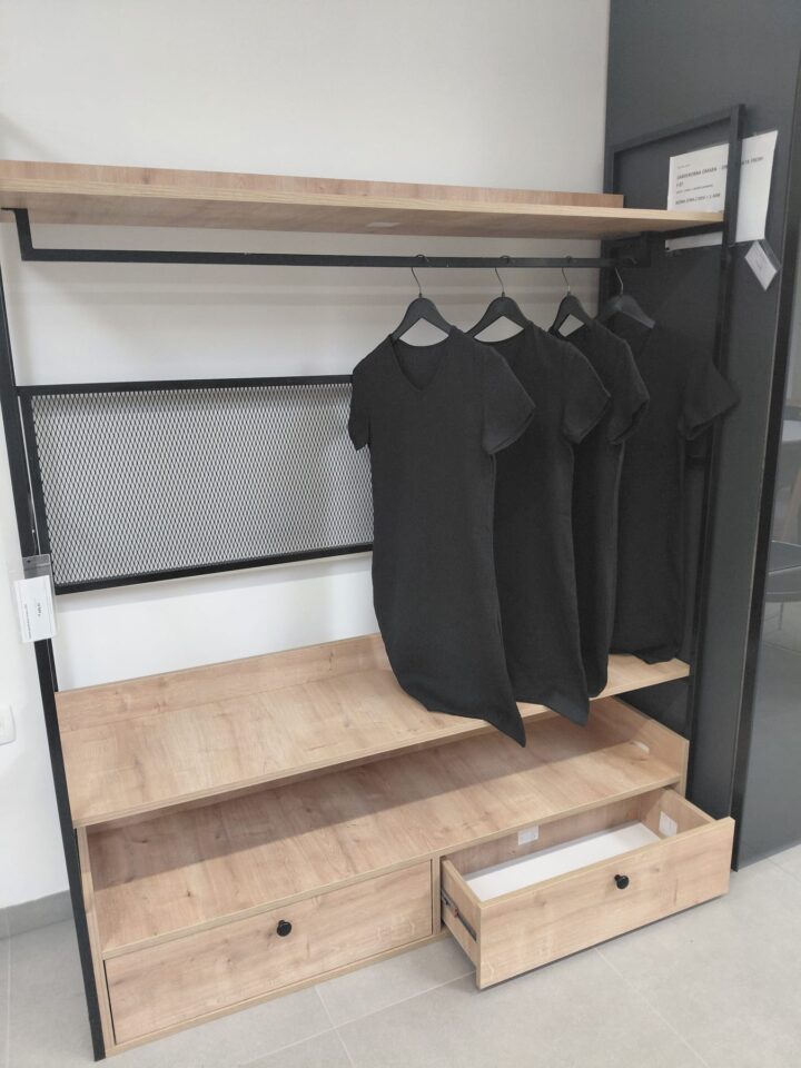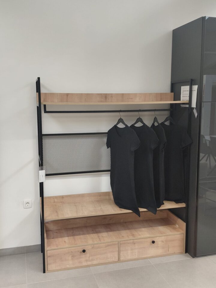 Odprta garderobna omara je izdelana iz oplemenitene pohištvene plošče v videzu hrasta.