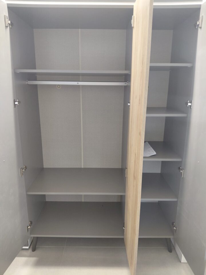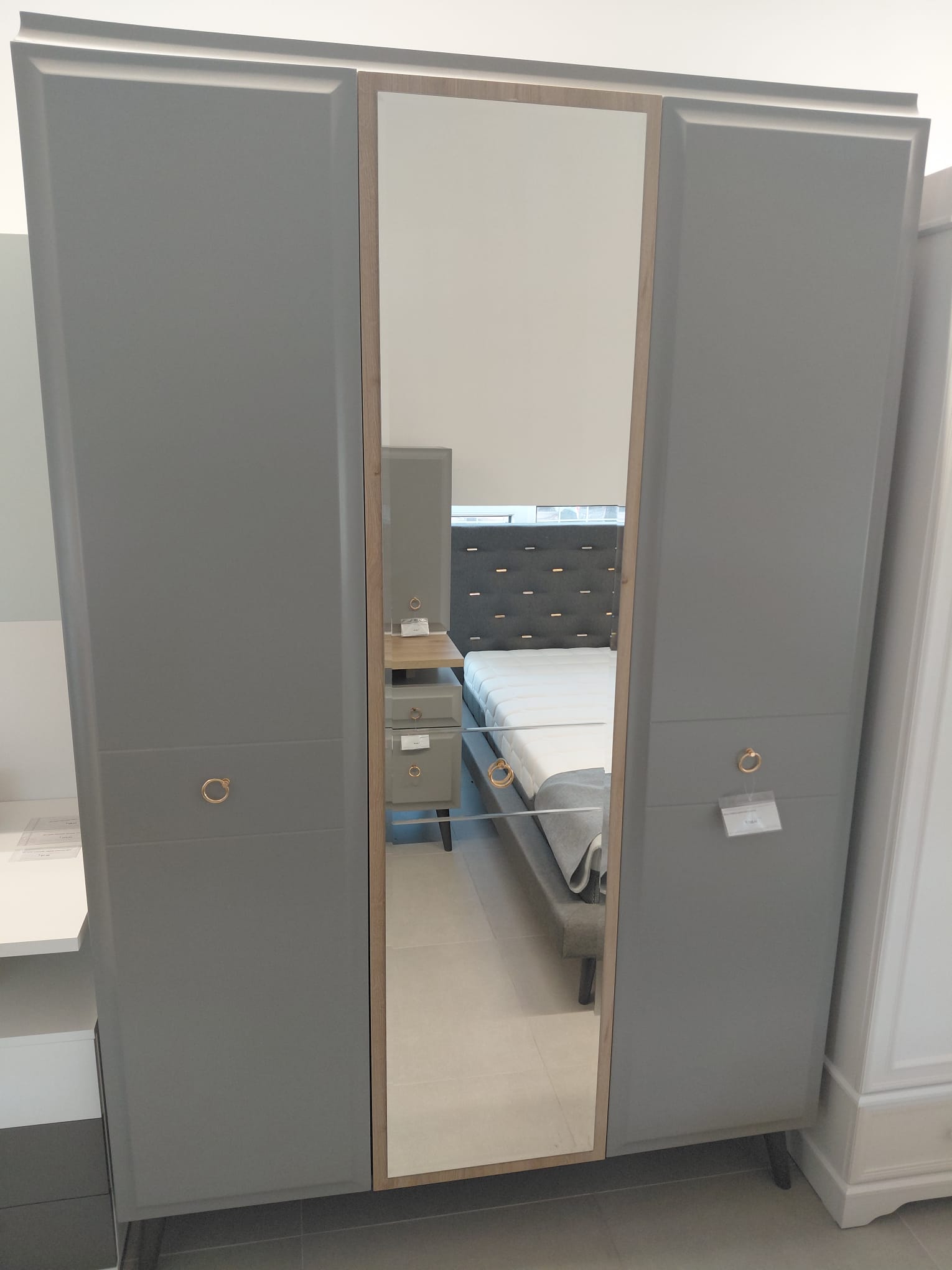 z dimenzijami 136x60x208 cm, ta omara nudi dovolj prostora za oblačila in druge predmete. Izdelana je iz kakovostne iverne plošče debeline 18 mm, medtem ko je zadnja stran izdelana iz 8 mm debele plošče. Vrata so izdelana iz MDF-a in lakirana, kar nudi visokokakovosten in estetsko privlačen zaključek Robovi so zaščiteni s PVC-jem debeline od 0,4 do 1 mm, kar zagotavlja dodatno vzdržljivost in eleganco. Omara vključuje praktično LED osvetlitev znotraj garderobe, ki olajša iskanje oblačil in dodatkov. Vrata so opremljena z mehkimi tečaji, ki omogočajo tiho in enostavno zapiranje, moderni izgled omare pa dopolnjuje ogledalo, ki je integrirano na ena od vrat. Noge pa so izdelane iz masivnega lesa, kar zagotavlja stabilnost in trajnost. Ta tridelna garderobna omara iz kolekcije Moon je idealna za mladinske sobe, spalnice ali vhodne prostore, saj nudi sofisticiran videz in visoko funkcionalnost.