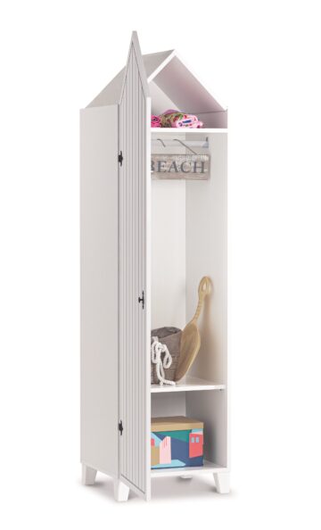 Enodelna leva garderobna omara Tropic bo pričarala morsko vzdušje kar doma. Omara je izdelana iz oplemenitene iverne plošče E1 ter debeline 18mm. Vsi robovi so ABS zaobljeni. Vrata imajo mehanizem mehkega zapiranja. V notranjosti omare sta dve polici in obešalni drog.
