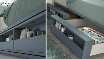 - Postelja višja s shranjevalnim prostorom in drsnimi vrati, ter nižja postelja z dvema predaloma ki se mehko zapirata, za ležišče 90 x 190 cm.