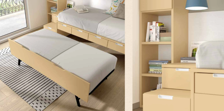 • Postelja za vzmetnico 90 X 190, ki ima tudi dodatno posteljo za vzmetnico 90 x 190 cm. Širina 101 cm x višina 47,5 cm x dolžina 200 cm. Ob postelji je zidna obloga z dodtnim shranjevalnim prostorom