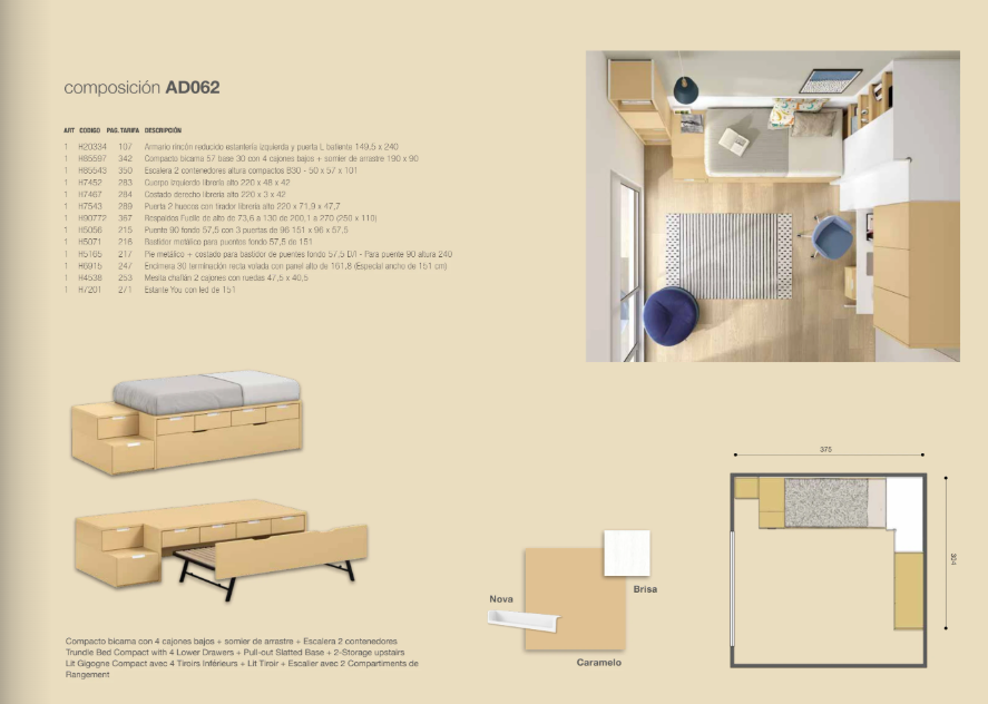Otroška soba kot na sliki vzame v dolžino 374 cm na zidu kjer je postelja, ter 131 cm v smeri pisalne mize. Otroške soba Compactos vas bo navdušila s svojo kvaliteto, izvirnostjo in možnostjo prilagajanja po meri. Elemente sestavov lahko med seboj kombinirate. Izbirate lahko med široko paleto barv in različnih ročajev. Pisalno mizo ali garderobno omaro lahko prilagodimo na centimeter natančno v kolikor imate težavo dobiti standardne mere v prostor. Pohištvo proizvaja eden od vodilnih španskih proizvajalcev otroškega pohištva. Uporablja melaminsko zaščito visoke kakovosti, ki je odporna zoper praskam in nezaželenim madežem. Vrata in predali se mehko zapirjo (izjema so tisti, ki so na koleščkih pod posteljo) . Debelina vseh front in korpusov garderobnih omar je 19 mm medtem, z izjemo dna in stropa omare, ki je 30 mm Prav tako je debelina vseh nosilnih delov postelj, pisalne mize in podpornih elementov 30 mm.  Vsi robovi so 30 mm zaobljeni s tehniko post forming, za katero velja visoka odpornost in neviden rob. Slike so le inspiracija, ki jo kasneje mi prilagodimo vašemu prostoru. Pošljite nam mere vašega prostora in vam naredimo brezplačni 3D idejni izris, da vidimo kako gre vse skupaj v prostor.  Pohištvo je delano z namenom, da traja. S proizvajalcem imamo res odlične izkušnje in verjamemo, da bo tudi vam všeč, kakor tudi mnogim do sedaj.