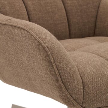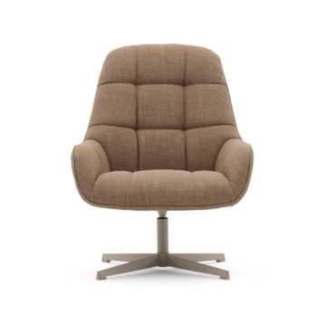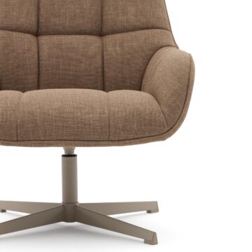 Fotelj Jaspe rjave barve z vrtljivim podnožjem je izdelan iz kakovostne kombinacije materialov, vključno s topolovim vezanim lesom, jeklom v sivi barvi, tkanino in poliuretansko peno. Takšna sestava mu zagotavlja trpežnost in udobje pri sedenju.