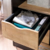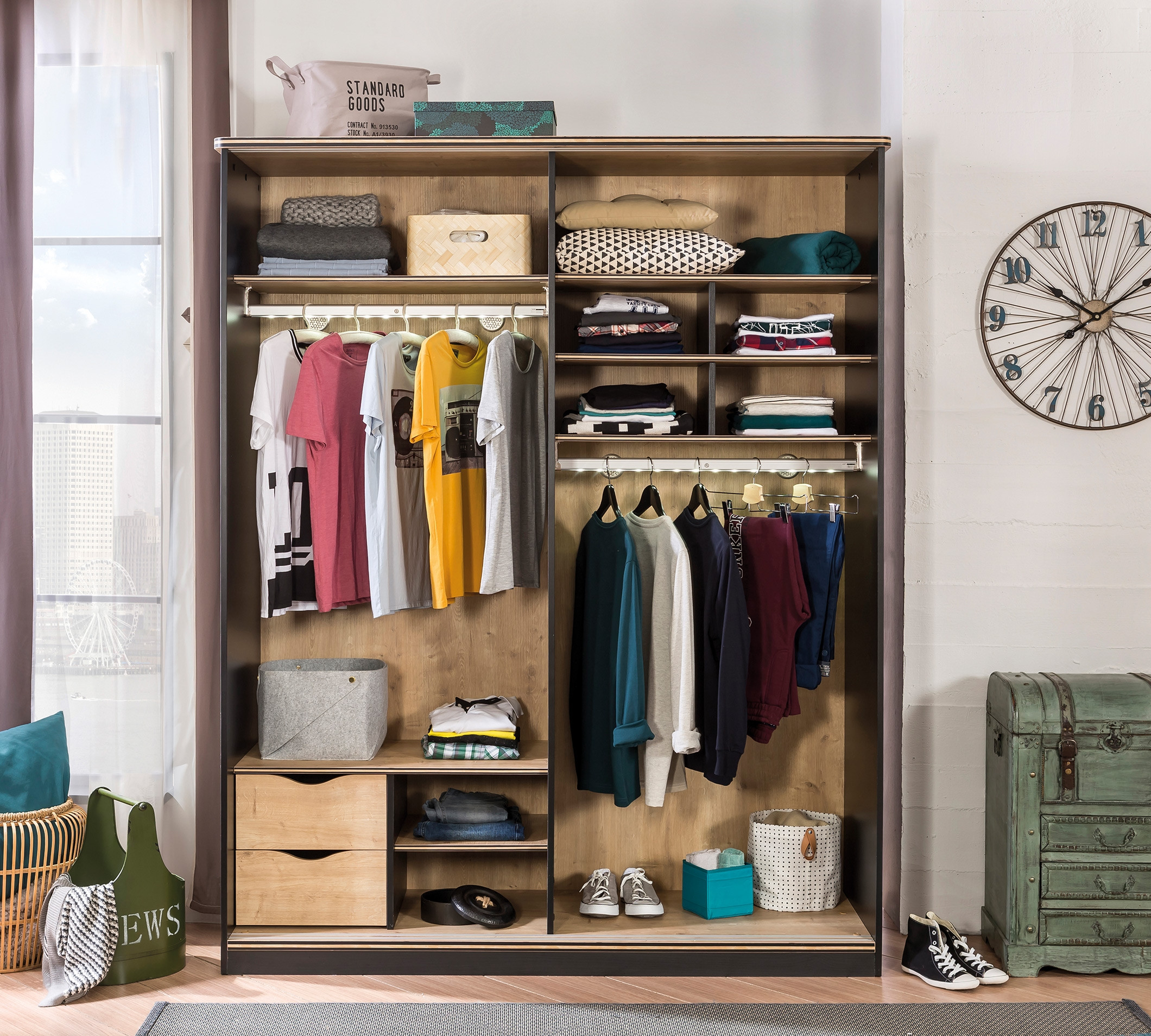 Garderobna omara Black ima drsna vrata, ena so črna, druga pa v barvi lesa. Ima dva obešalnika, ki sta osvetljena. V notranjosti so tudi številne police in dva predalnika, ki se mehko zapirata. Omara je zaščitena z melaminom, ki poskrbi, da ne pride do prask.