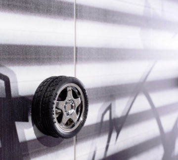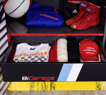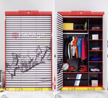 Garderobna omara Champion Racer je v obliki avtomobilske garaže. Sestavljena je iz treh vrat z mehanizmom harmonike. Za vrati se nahajata dva predala, ki se mehko zapirata, številne police in obešalnik z lučjo. Zaščitena je z melaminom, odpornim zoper prask in umazanije.