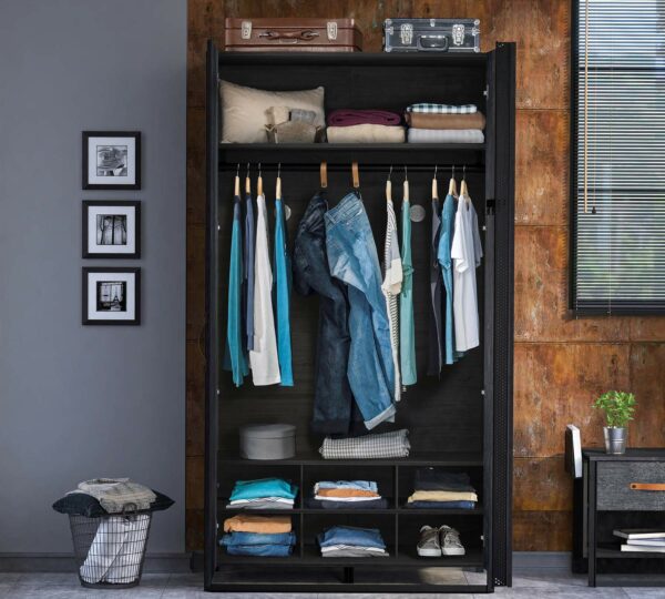 Garderobna omara Dark Metal ima vrata, ki se mehko zapirajo. Ta omara resnično zagotavlja ogromno prostora za hranjenje oblačil. Ima številne police, obešalnik, predal in celo obešalnike na vratah. Kovinsko podnožje je v črni barvi. Zaščitena je z melaminom, ki ščiti pred praskami in prahom.