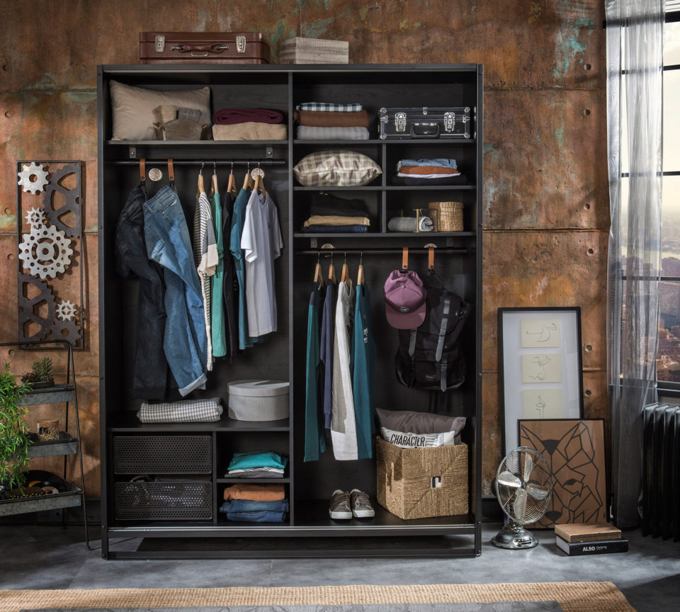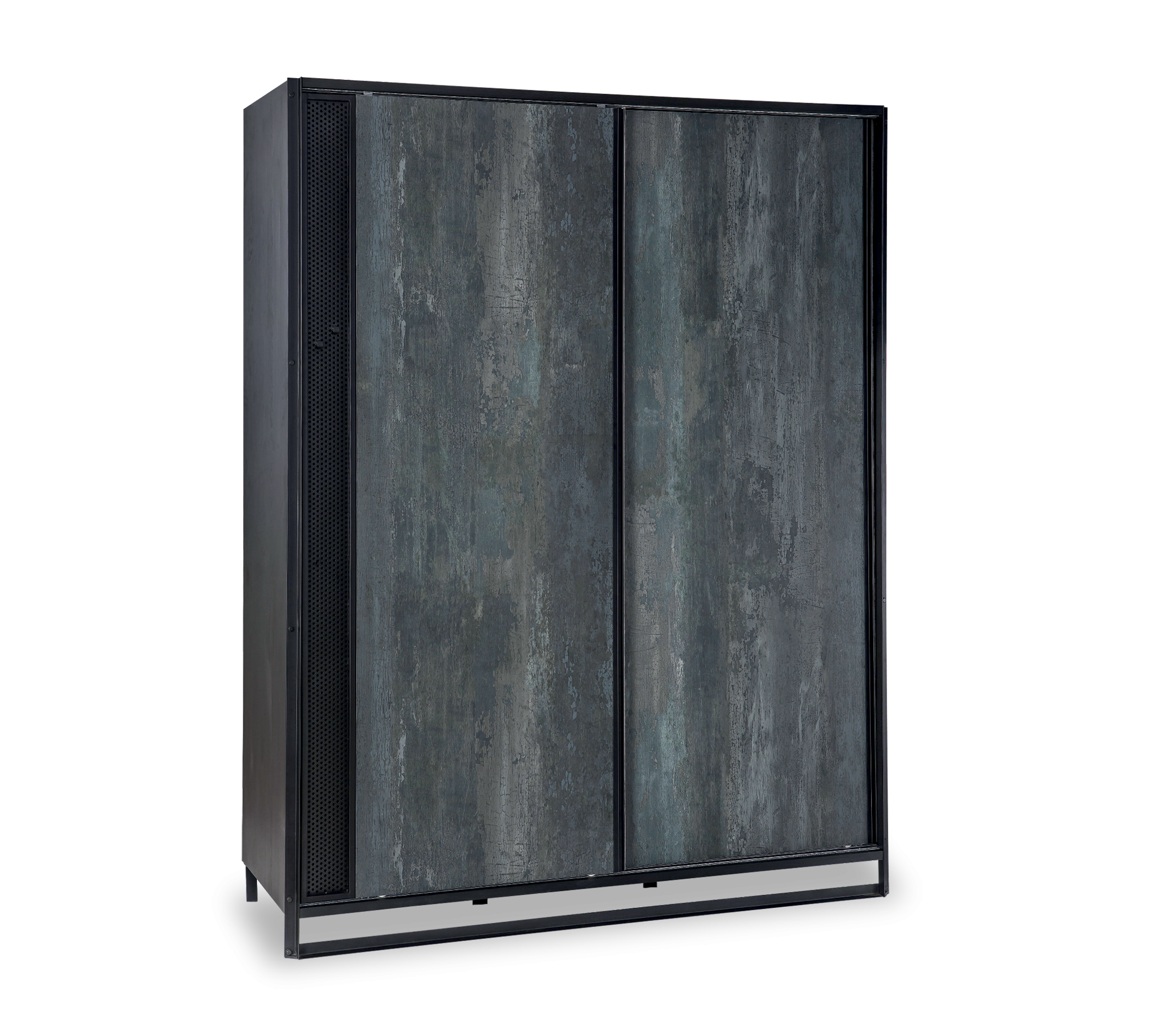 Garderobna omara Dark Metal ima drsna vrata. Kovinsko podnožje je v črni barvi. V notranjosti je dovolj polic za hranjenje oblačil, prav tako pa se tam nahajata tudi dva obešalnika in dva predala. Zaščitena je z melaminom, ki ščiti pred praskami in prahom.