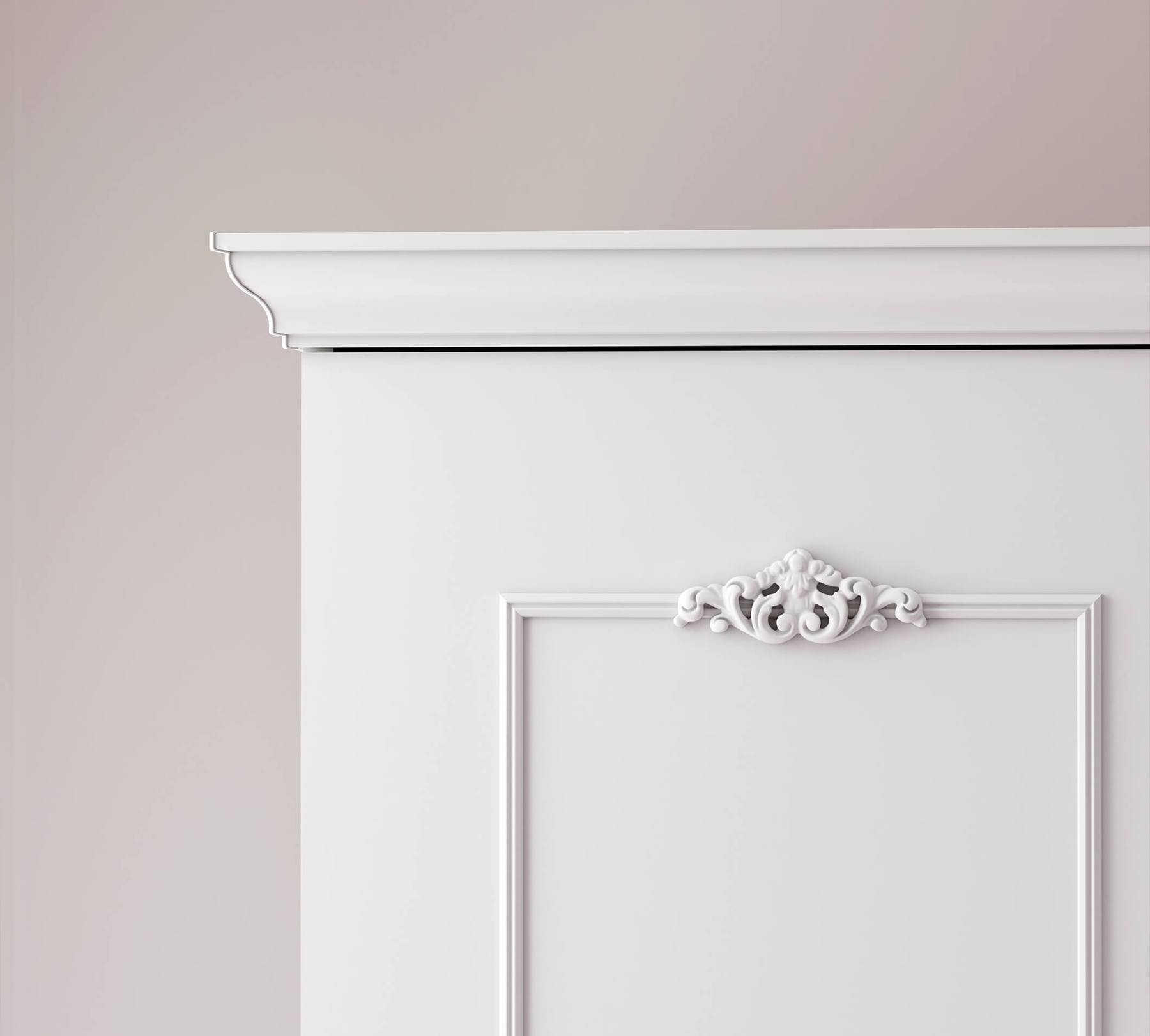 Garderobna omara Romantica je sestavljena iz dvojih vrat, ki imajo sistem mehkega zapiranja. Za dvojimi vrati se nahaja obešalnik z lučjo in nekaj polic. Za drugimi vrati pa se nahajajo številne police. Ročaji na omari so lepo zaobljeni. Klasičen izgled poudarjajo dodatki na vratih. Na voljo je v brezčastni beli barvi, ki je zaščitena z melaminom, odpornim zoper prask in umazanije.