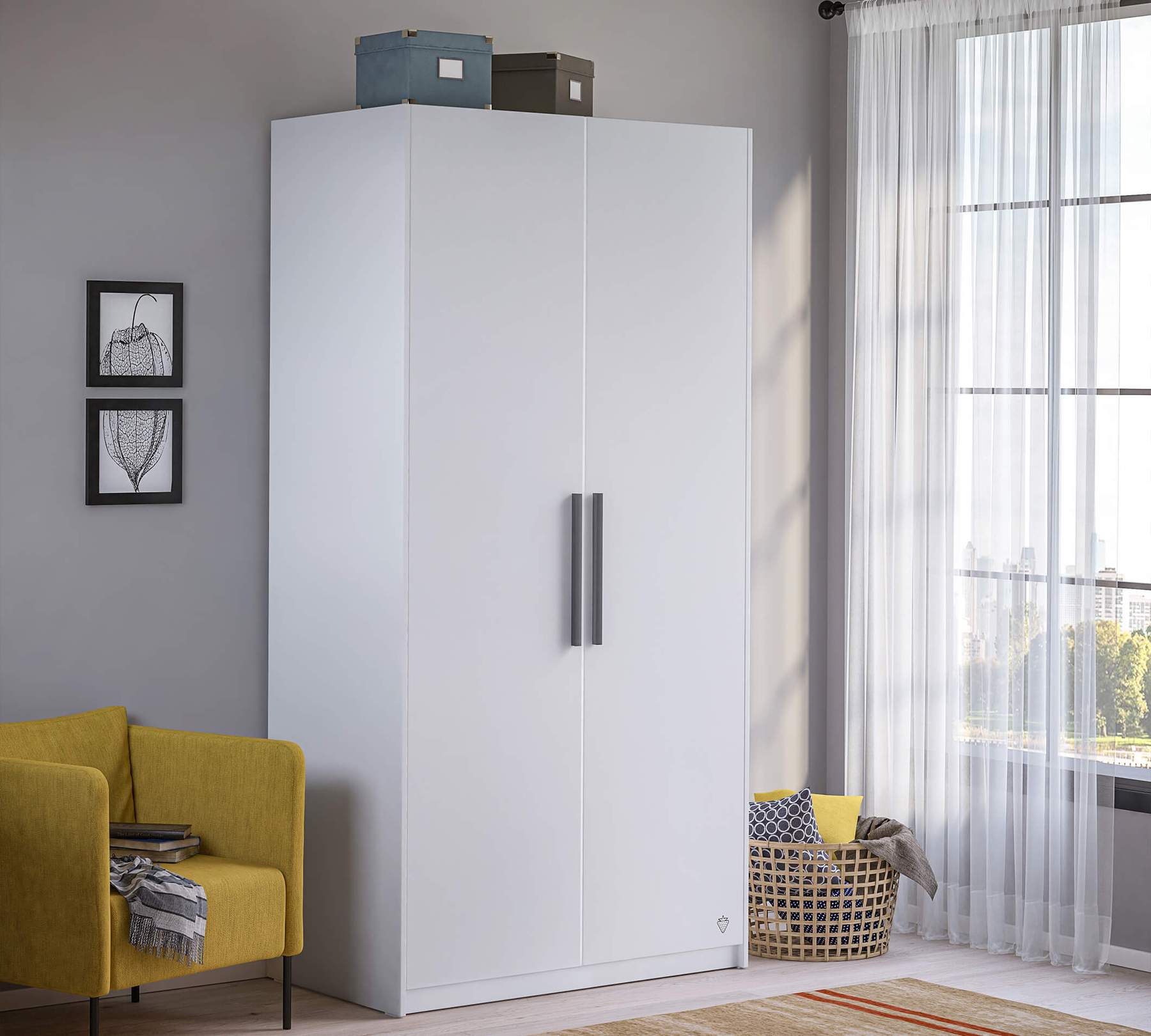 Garderobna omara White ima dvoja vrata, ki se mehko zapirajo.  Obogatena je s sivimi ročaji. Vlaga se v omari ne more pojaviti zaradi prezračevalne kapsule v notranjosti. V notranjosti je obešalnik in številne police. Na voljo je v beli barvi. Zaščitena je z melaminom, ki ščiti pred praskami in prahom.