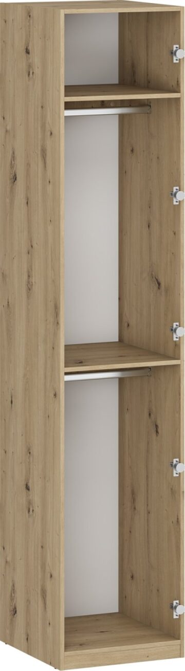 Sodobna in prilagodljiva garderobna omara “Flex” je idealna rešitev za vsak dom, ki ceni stil, funkcionalnost in individualnost. Izdelana je iz visokokakovostne laminirane plošče, ki je odporna na poškodbe in enostavna za vzdrževanje. Notranjost vključuje dve polici in obešalna droga kar omogoča optimalno organizacijo prostora. Možnost izbire različnih barv in materialov zagotavlja, da se omara popolnoma ujema z vsakim prostorom in osebnim stilom.