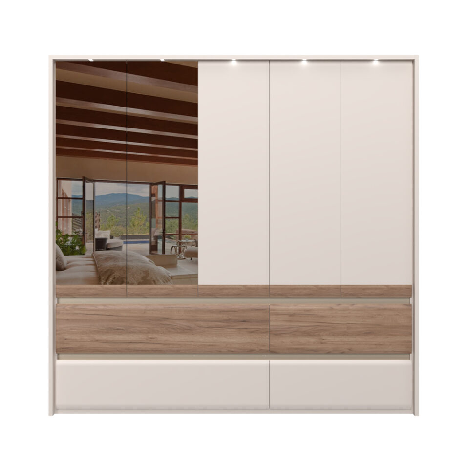 Notranjost omare je oblikovana v toplem tekstilnem dekorju, ki obljublja občutek domačnosti. Soft-close tečaji in drsniki z zaviralcem omogočajo tiho zapiranje kril in predalov, kar pripomore k dodatnemu udobju ob stalni uporabi. Estetski videz omare je popoln z debelimi stranskimi in stropnimi letvami ter osvetlitvijo.