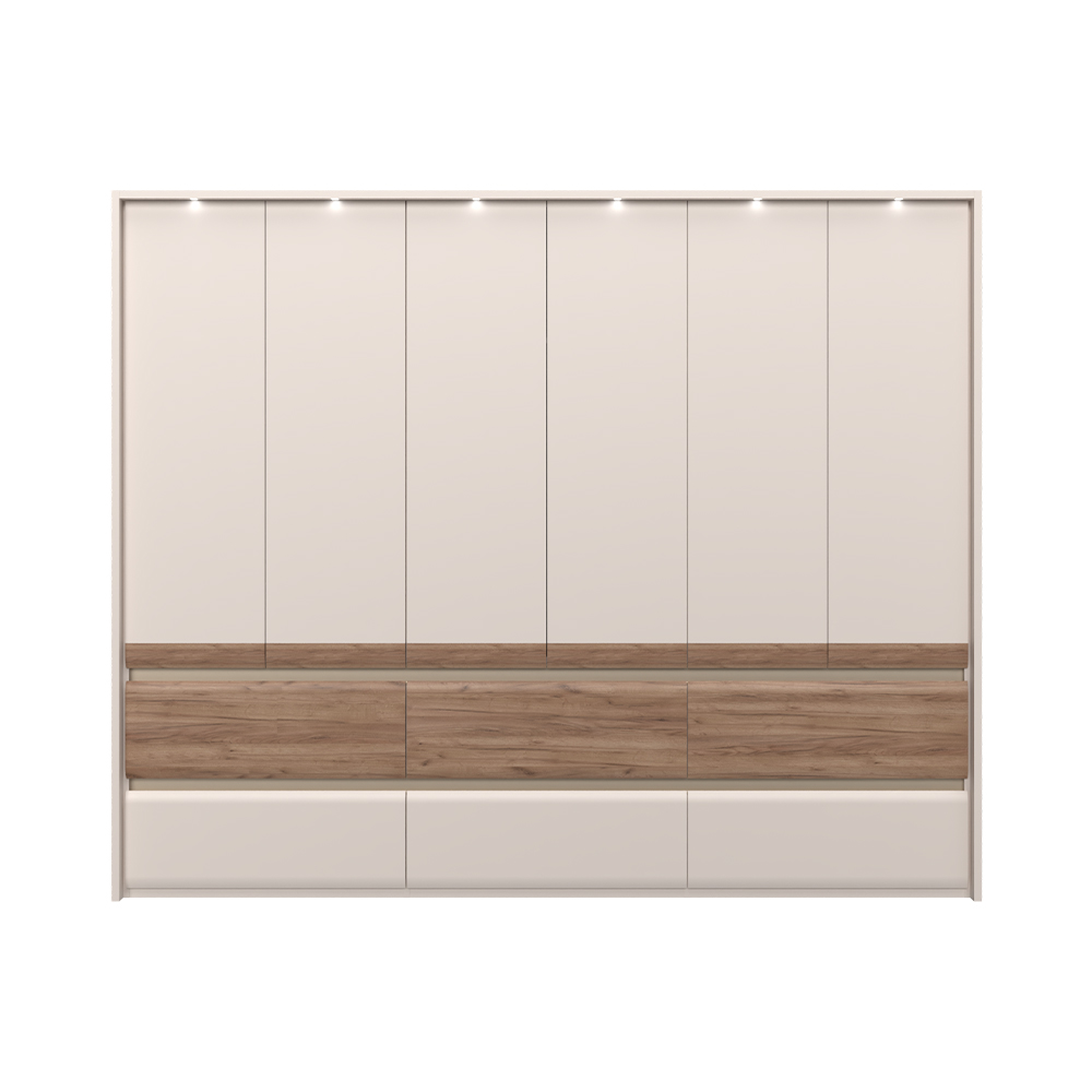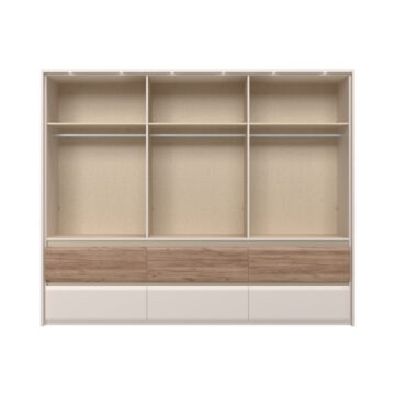 Notranjost omare je oblikovana v toplem tekstilnem dekorju, ki obljublja občutek domačnosti. Soft-close tečaji in drsniki z zaviralcem omogočajo tiho zapiranje kril in predalov, kar pripomore k dodatnemu udobju ob stalni uporabi. Estetski videz omare je popoln z debelimi stranskimi in stropnimi letvami ter osvetlitvijo.