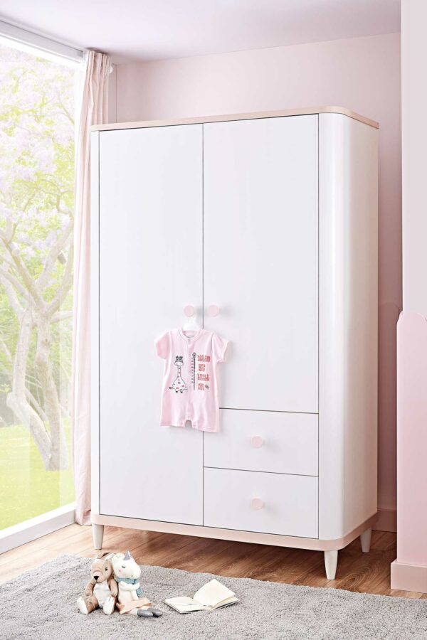 Elegantna garderobna omara Lili je eden izmed osrednjih kosov istoimenskega pohištvenega sestava za dojenčke. Odlikuje se s simpatičnim videzom in prijetno roza–belo kombinacijo. Za shranjevanje ima več polic ter dva predala, delujoča na mehanizem tihega zapiranja. Obešalni palici imata LED svetilo na senzor. Izdelana je iz oplemenitene iverne plošče, zaščitene z ABS robnim trakom.