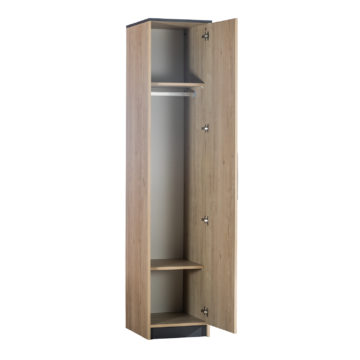 Garederobna omara Milano elegantnost črpa iz kombinacije črne barve in lesa. Vrata delujejo na mehanizem tihega zapiranja, obešalna palica ima LED svetilo na senzor. Izdelana je iz oplemenitene iverne plošče in kovine. Robove ščiti ABS robni trak.