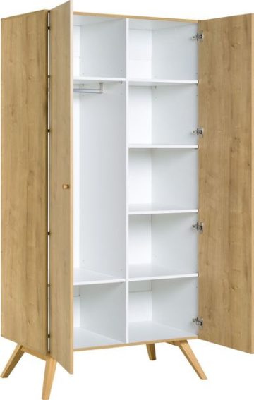 Preprosta in minimalistična garderobna omara Nature je izdelana iz melaminsko zaščitene iverne plošče. Garderobna omara ima za parom vrat drog za obešanje oblačil in skupno šest polic. Podnožje je v barvi hrasta, notranjost pa bela. Videz omare olepšuje furnir od hrasta.