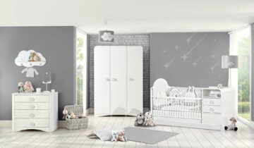 Garderobna omara Oblaček je sodobno in zanimivo oblikovan kos pohištva. Odlikuje se s prikupnim motivom oblaka ter nežnim in umirjenim videzom. Prostorna in sodobna zasnova vključuje tri vrata, za katerimi se nahaja več polic in obešalno palico z LED svetilom. Izdelana je iz MDF in iverne plošče.