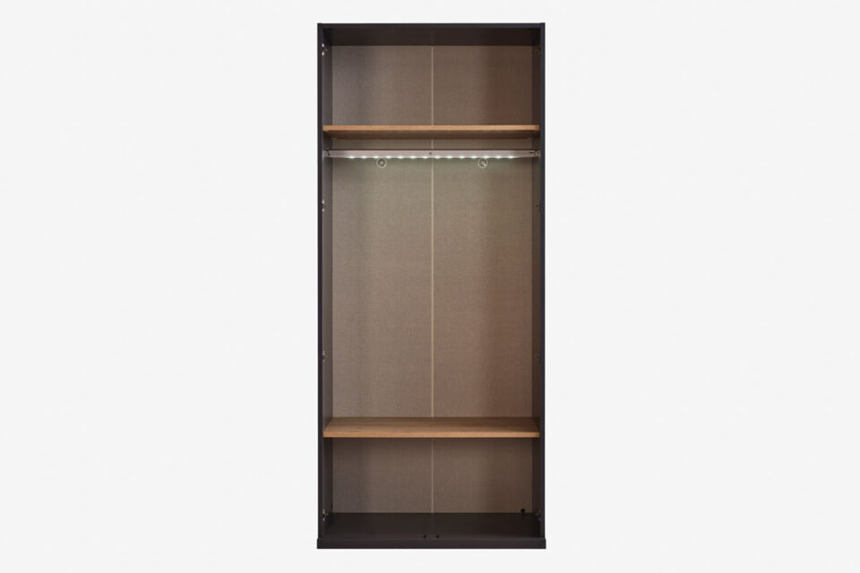 - Notranja konfiguracija: Z dvema policama in osvetljenim drogom za obešanje omara ponuja organizirano shranjevanje in enostaven dostop do oblačil.